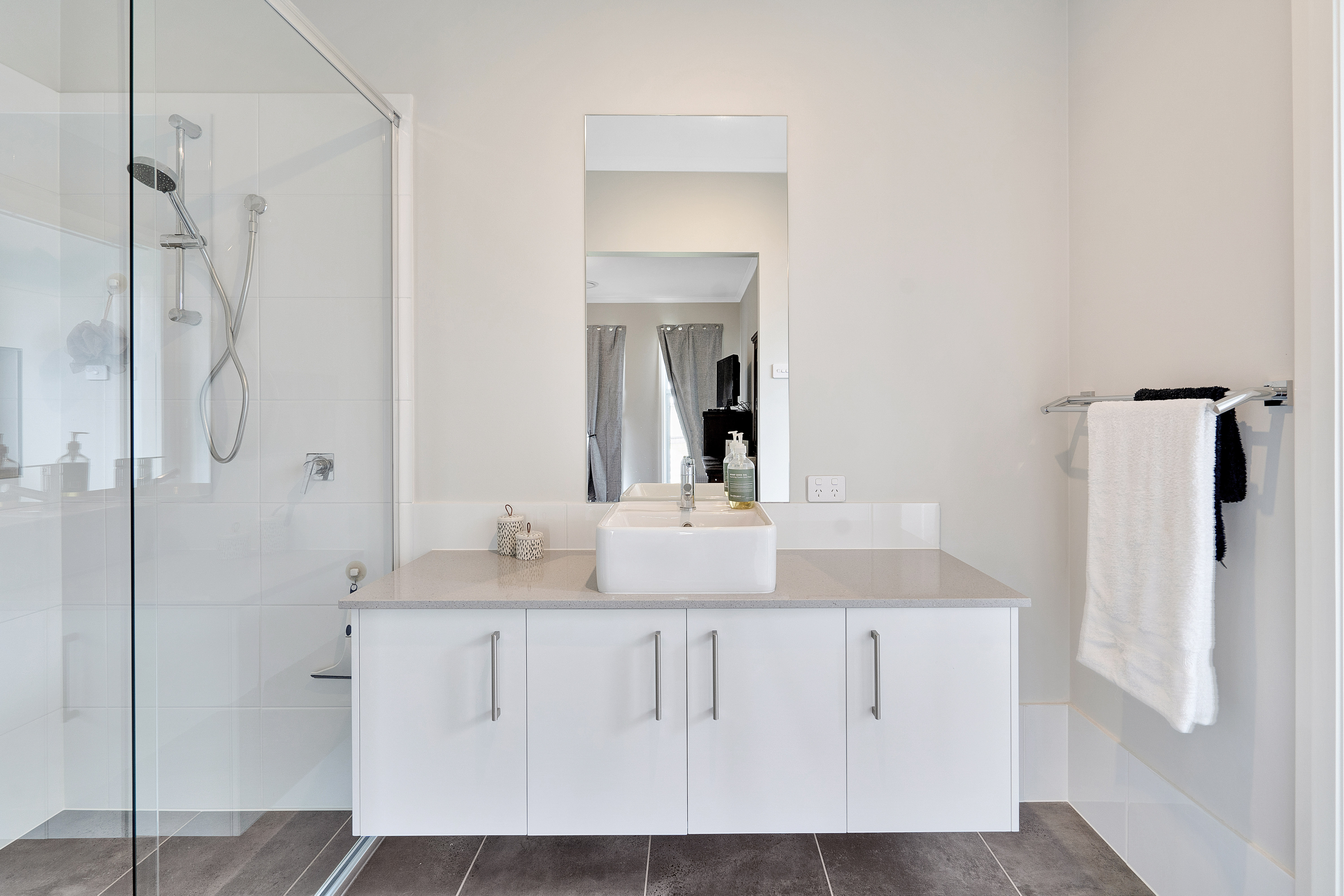 EN-SUITE Separate WC Frosted glass sliding window Grey floor tiles Oversized shower Clear glass screen Shower neish Rail shower head Floating vanity Stone vanity bench Wall mounted mirror Double towel rail Sliding door to WC Three-way light