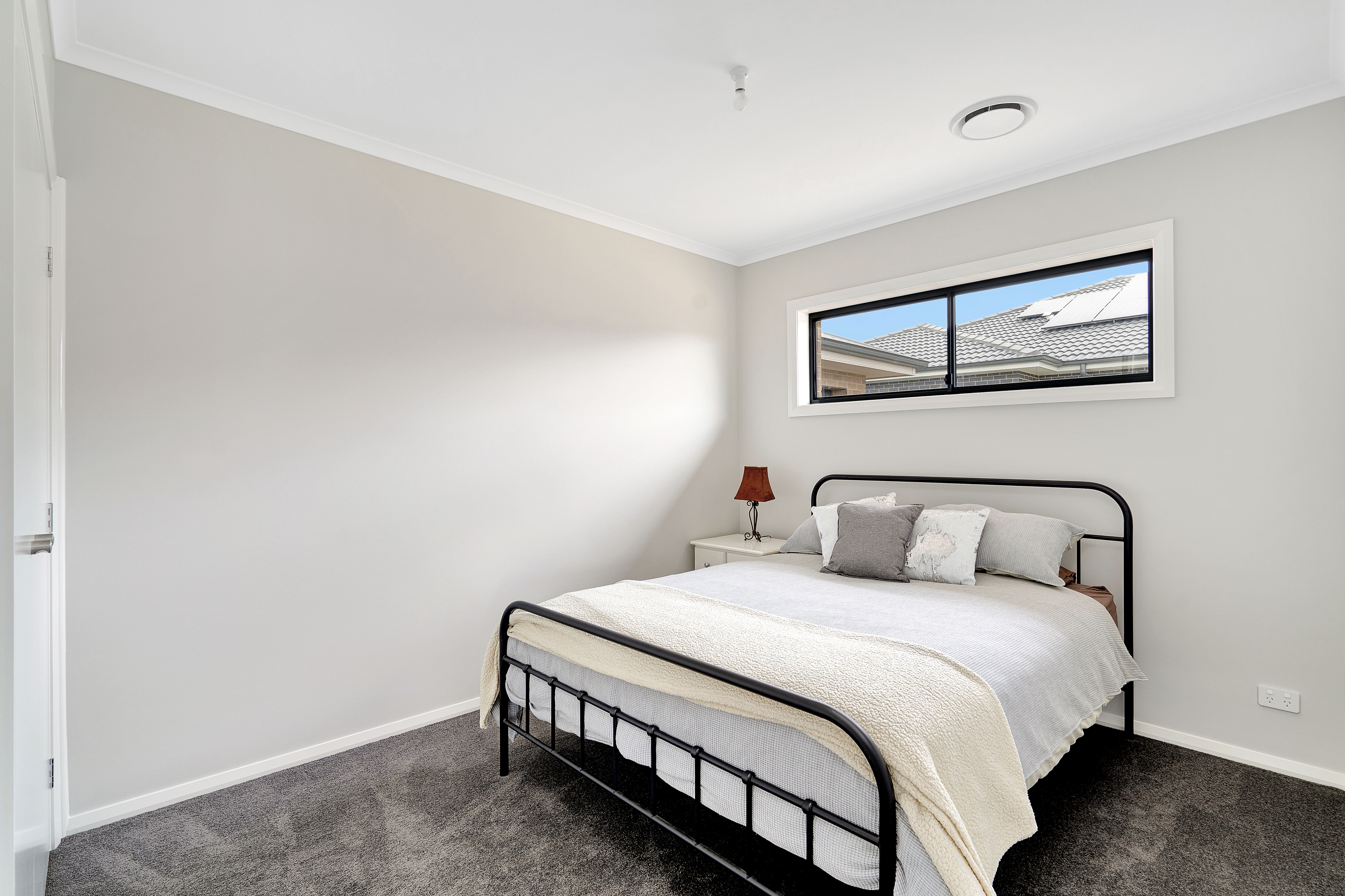 MAIN Dark grey plush carpet Pale grey walls White ceilings Bare bulb light 3 Awning windows Grey curtains TV point 3 double power points Oversized door into main Walk in robe with window for natural light