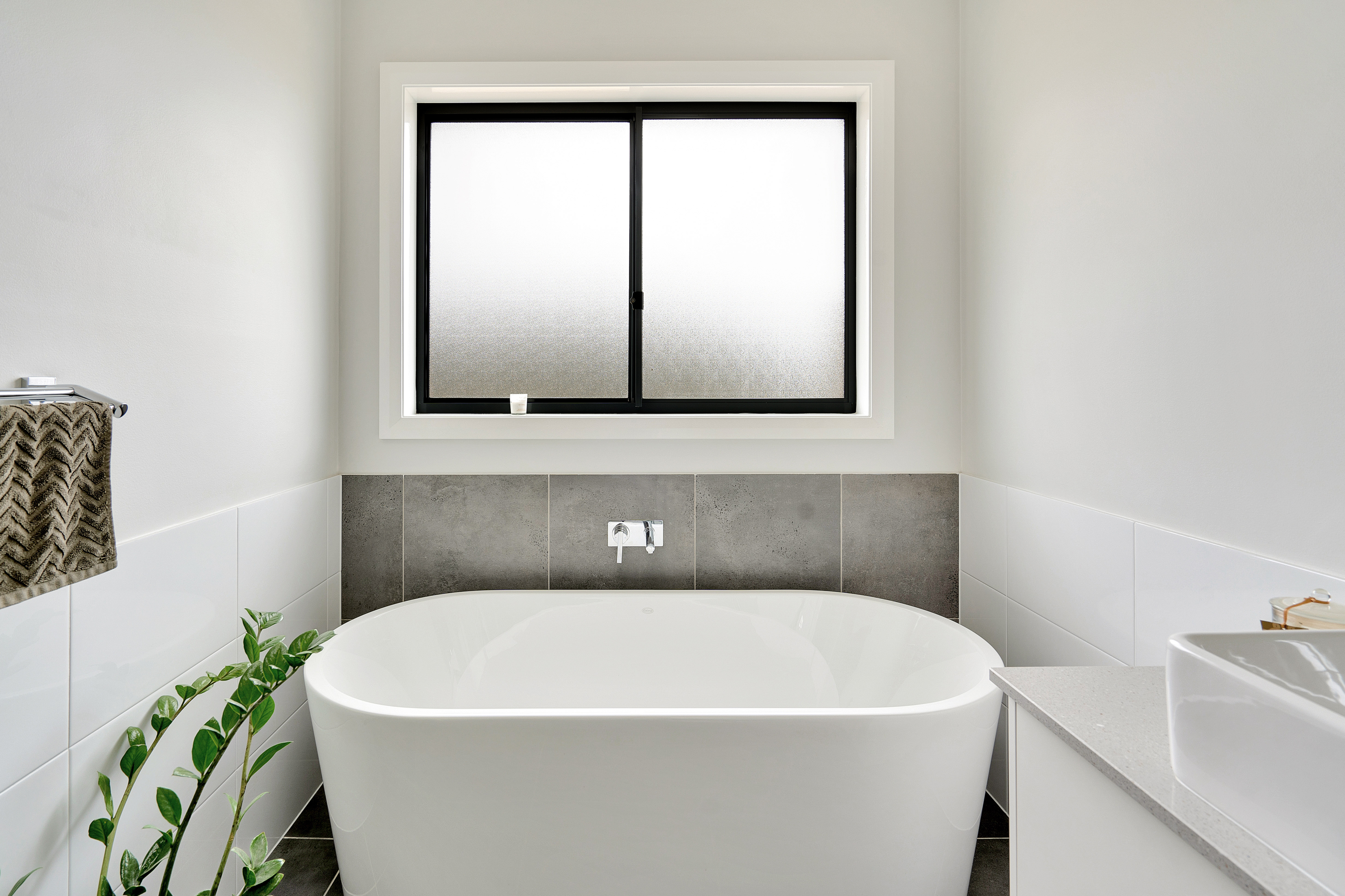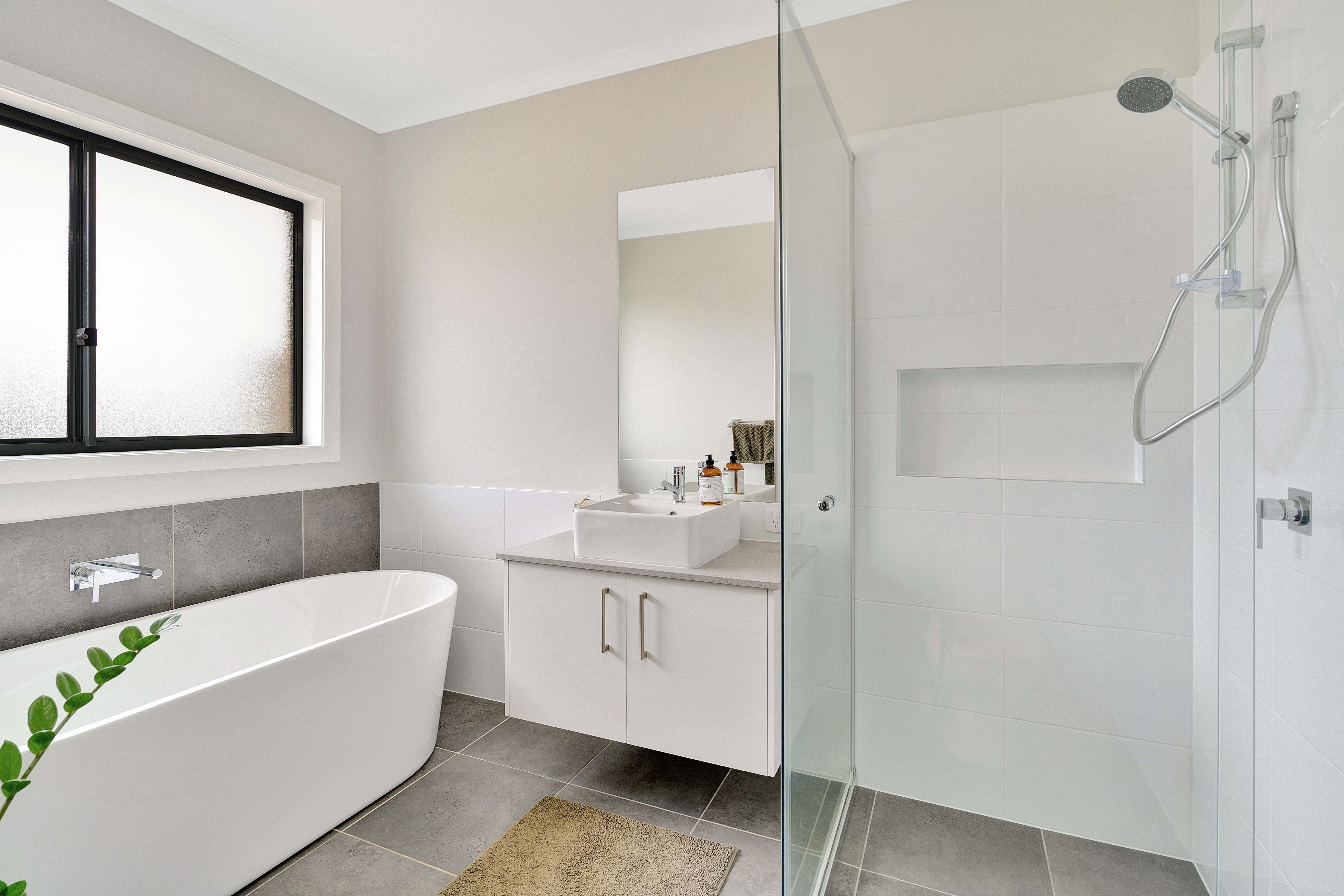 BATHROOM Grey floor tiles Porcelain WC Double towel rail Free standing feature bath Stone vanity Wall mounted mirror Frosted glass sliding window Free standing shower Rail shower head Shower neish Clear glass shower screen Chrome tapware